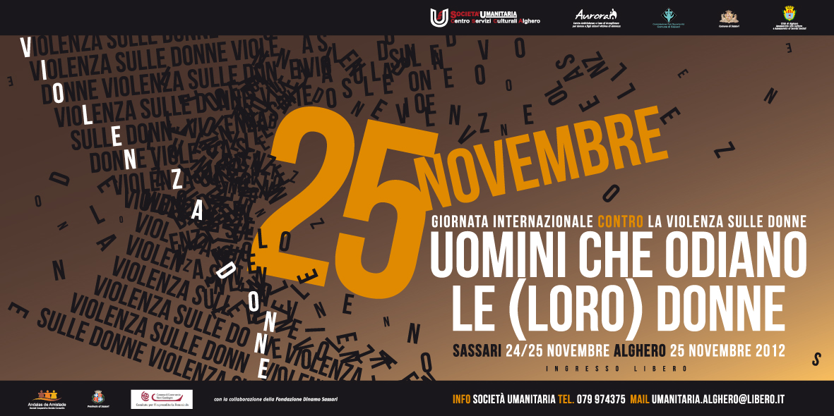 Dal 2007 la Società Umanitaria di Alghero e il Progetto Aurora del Centro Antiviolenza di Sassari ricordano questa Giornata attraverso proiezioni, spettacoli teatrali, presentazioni di libri e convegni. Da quest’anno anche la Commissione per le Pari Opportunità del Comune di Sassari partecipa attivamente alla manifestazione. Così nasce Uomini che odiano le (loro) donne, due giornate tra Sassari e Alghero, focalizzate sul tema della violenza intrafamiliare, promosse con forza da una rete importante di istituzioni pubbliche e private. Riteniamo indispensabile, infatti, proseguire nella costruzione di un modello dinamico di cooperazione culturale che aggreghi le realtà più attente della comunità per tentare di scatenare e interpretare i bisogni del territorio. Per questo abbiamo fortemente voluto al nostro fianco  – prima fra tutti – l’amministrazione comunale che, attraverso l’azione congiunta degli Assessorati alla Cultura e ai Servizi Sociali, guidati dall’assessore Romina Caula, ha sostenuto con convinzione l’intera manifestazione condividendone lo spirito, il senso e l’urgenza. Hanno raccolto lo stesso invito: la Provincia di Sassari, il Consorzio Andalas de Amistade, la  Camera di Commercio Nord Sardegna-Consorzio per l’Imprenditoria Femminile e la Fondazione Dinamo Sassari. Proprio la celebre squadra di basket, domenica 25, prima del fischio d’inizio della partita con il Vanoli Cremona,  ospiterà la performance di Elvira Conconi 108>, azione di sensibilizzazione dedicata alle vittime di violenza del 2012.