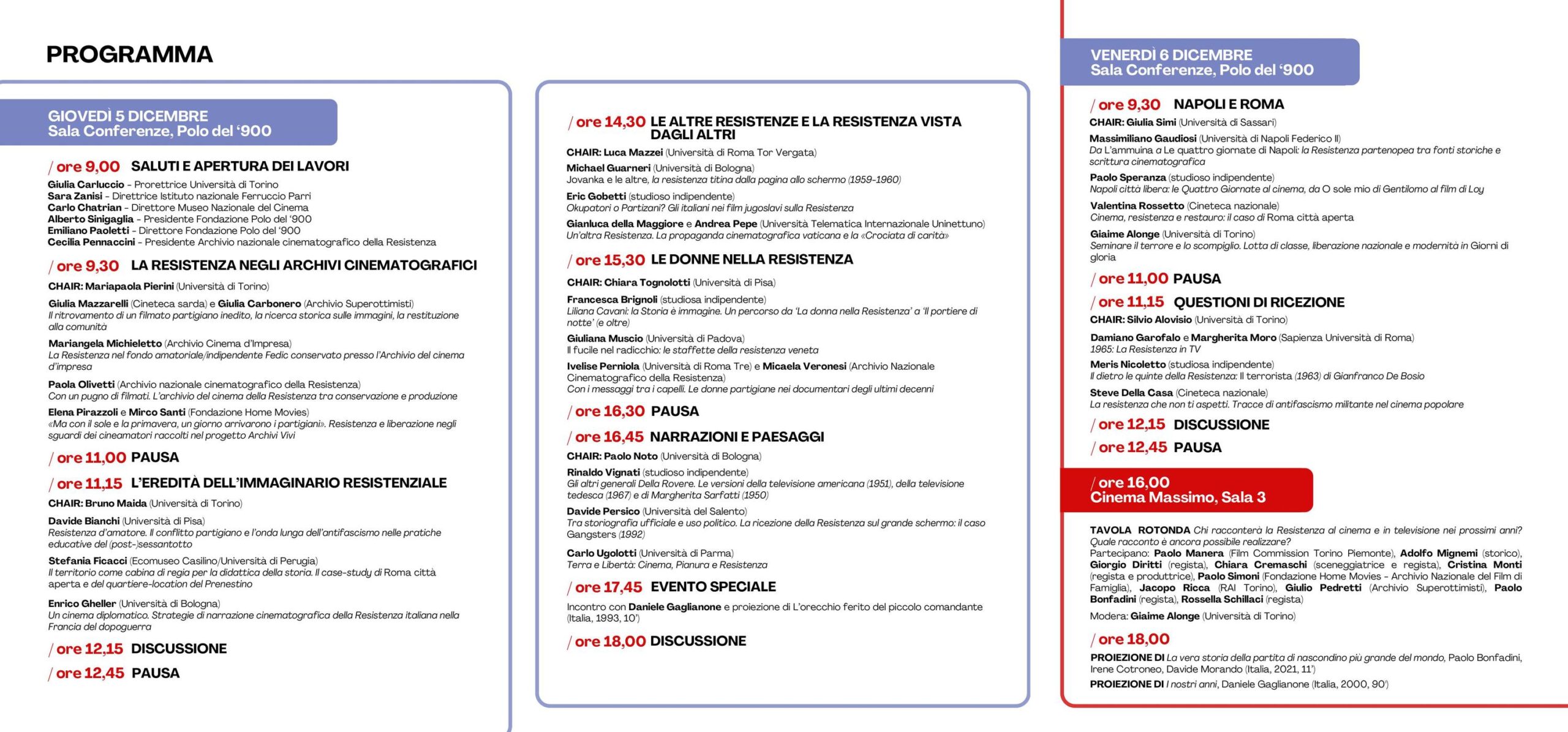 Al convegno partecipano esperti da tutta Italia, ricercatori, registi e storici che analizzeranno quanto è stato prodotto e quanto ancora è possibile realizzare anche grazie ai filmati conservati negli archivi amatoriali, al sostegno delle Film commission, alla collaborazione con i network televisivi, e naturalmente al supporto degli Istituti storici e delle Università. Durante le giornate si terranno anche proiezioni e una tavola rotonda organizzata in collaborazione con Film Commission Torino Piemonte in cui registi, archivisti, storici e produttori sono stati invitati a interrogarsi su chi racconterà la Resistenza al cinema e in televisione nei prossimi anni e quale racconto è ancora possibile realizzare con le immagini.