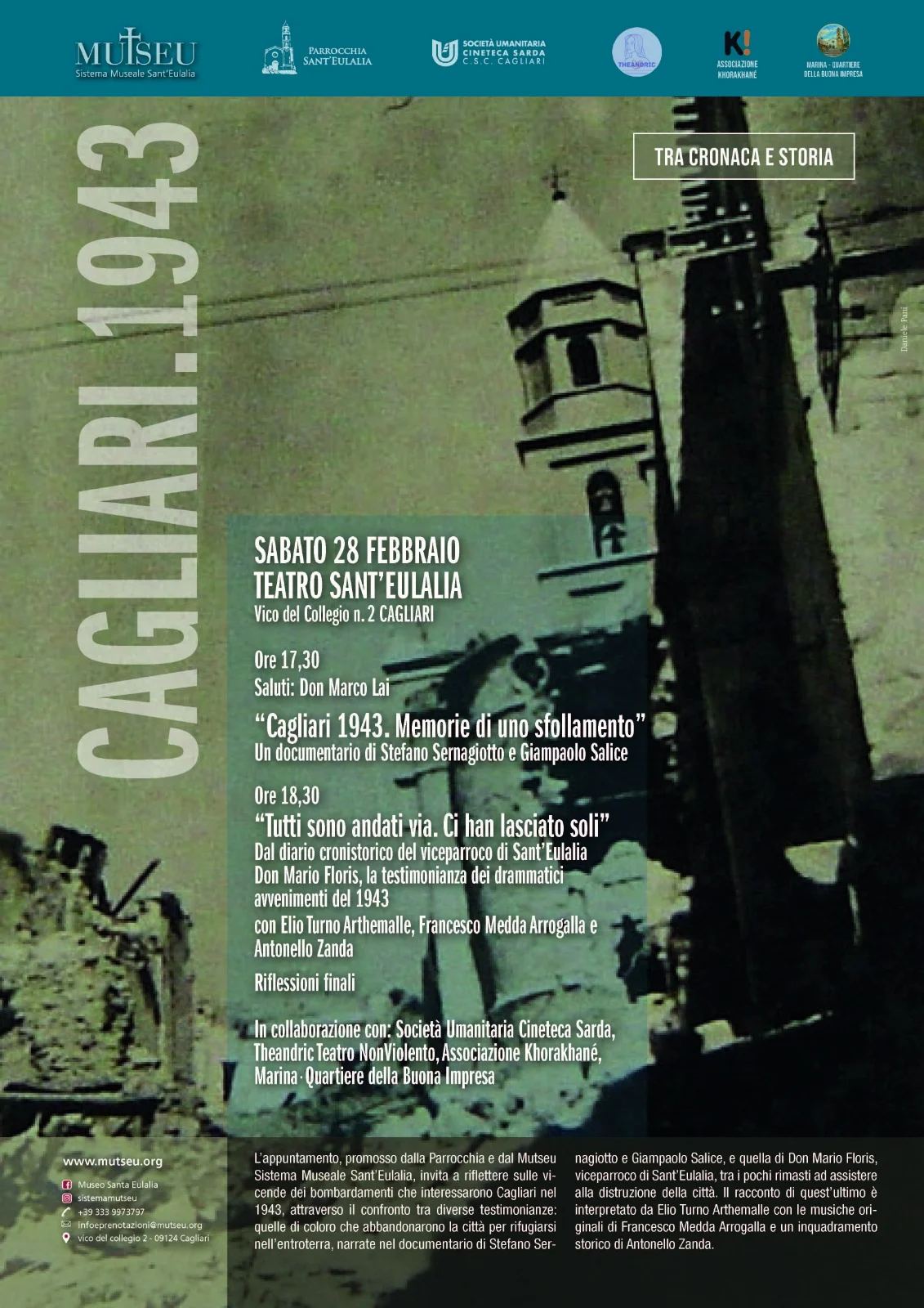 Dopo i saluti di Don Marco Lai alle ore 17.30 la riflessione inizierà con la proiezione del documentario “Cagliari 1943. Memorie di uno sfollamento”, firmato da Stefano Sernagiotto e Giampaolo Salice, che raccoglie e restituisce le voci di chi, nel 1943, fu costretto a lasciare Cagliari, portando con sé il peso della paura, dell’incertezza e della perdita. Saranno presenti gli autori. Alle ore 18.30 andrà in scena “Tutti sono andati via. Ci han lasciati soli”, lettura scenica tratta dal diario cronistorico di don Mario Floris, vice parroco di Sant’Eulalia e tra i pochi a non lasciare il quartiere durante i bombardamenti. La sua intensa testimonianza è interpretata da Elio Turno Arthemalle, accompagnata dalle musiche originali di Francesco Medda “Arrogalla” e arricchita dall’inquadramento storico di Antonello Zanda, che aiuta a collocare i fatti nel più ampio contesto della guerra.