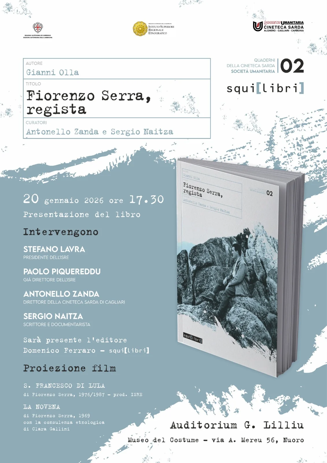 Il secondo incontro, promosso d’intesa con la Fondazione di Sardegna, è a Cagliari, il 21 gennaio, alle ore 17,30, alla Sala Fondazione di Sardegna (via Salvatore da Horta 2), con interventi di Ilaria Portas, assessora regionale alla Cultura, Paolo Serra, direttore regionale Società Umanitaria, Antioco Floris, professore dell’Università di Cagliari, Dante Olianas, dell’Associazione Iscandula. All’incontro seguirà la proiezione del film Ricordo di Gianni Olla e Fiorenzo Serra. A entrambi gli incontri prenderanno parte i due curatori del volume, Antonello Zanda e Sergio Naitza.