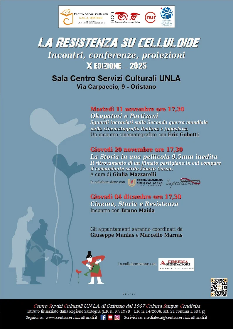 All’interno della rassegna “La Resistenza su celluloide. Incontri, conferenze, proiezioni”, organizzata dal Centro Servizi Culturali UNLA di Oristano, dalla Biblioteca Gramsciana ONLUS, da Nur e dall’Istituto Sardo per la Storia dell’Antifascismo e della Società Contemporanea (ISSASCO), si terrà un incontro realizzato in collaborazione con il CSC di Cagliari della Società Umanitaria e con Superottimisti – Archivio regionale di Film di Famiglia.