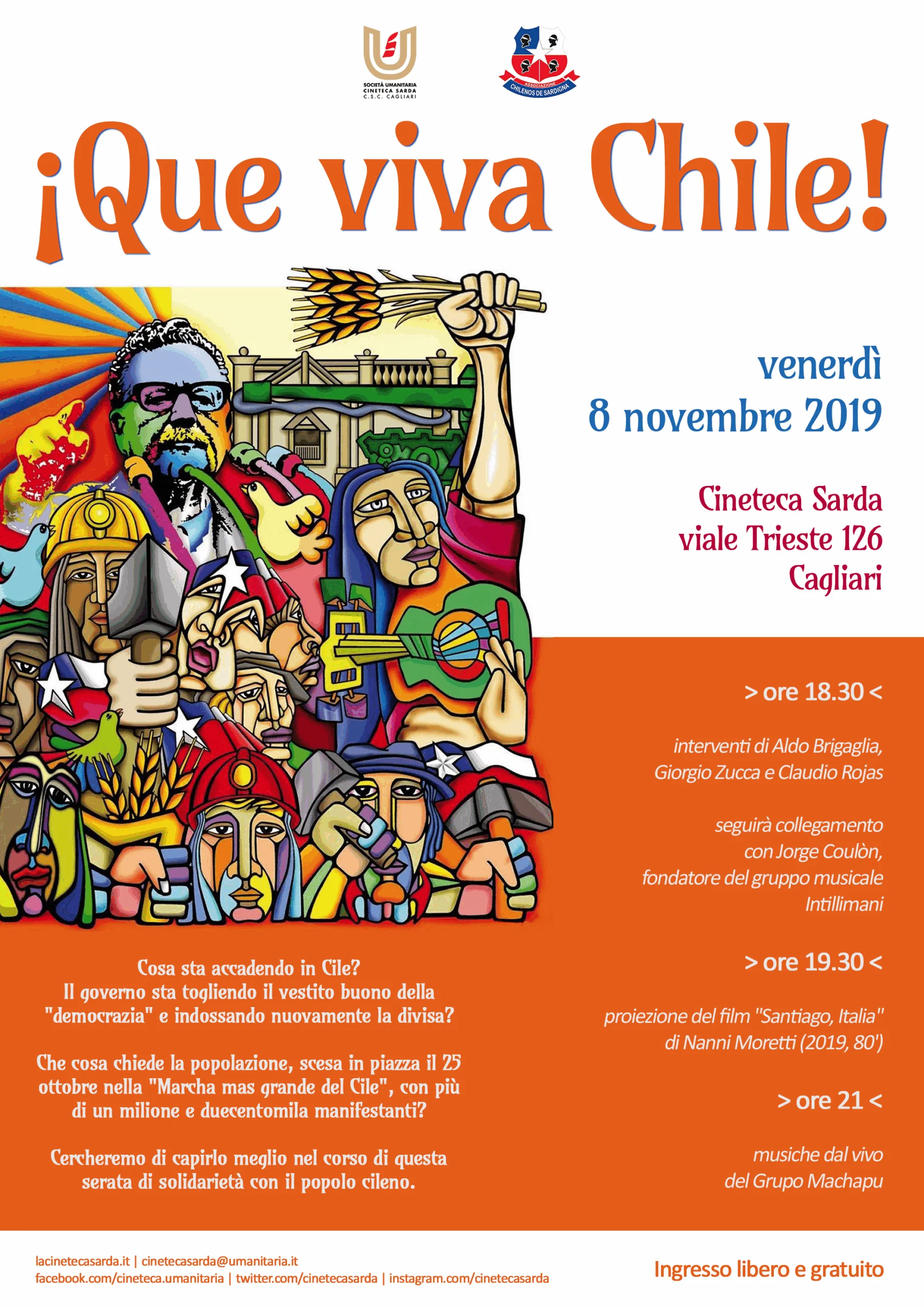 Venerdì 8 novembre in Cineteca dalle 18.30 una serata di solidarietà con il popolo cileno, per capire cosa sta accadendo in Chile e cosa chiede la popolazione, scesa in piazza il 25 ottobre nella “Marcha mas grande del Cile”, con più di un milione e duecentomila manifestanti.