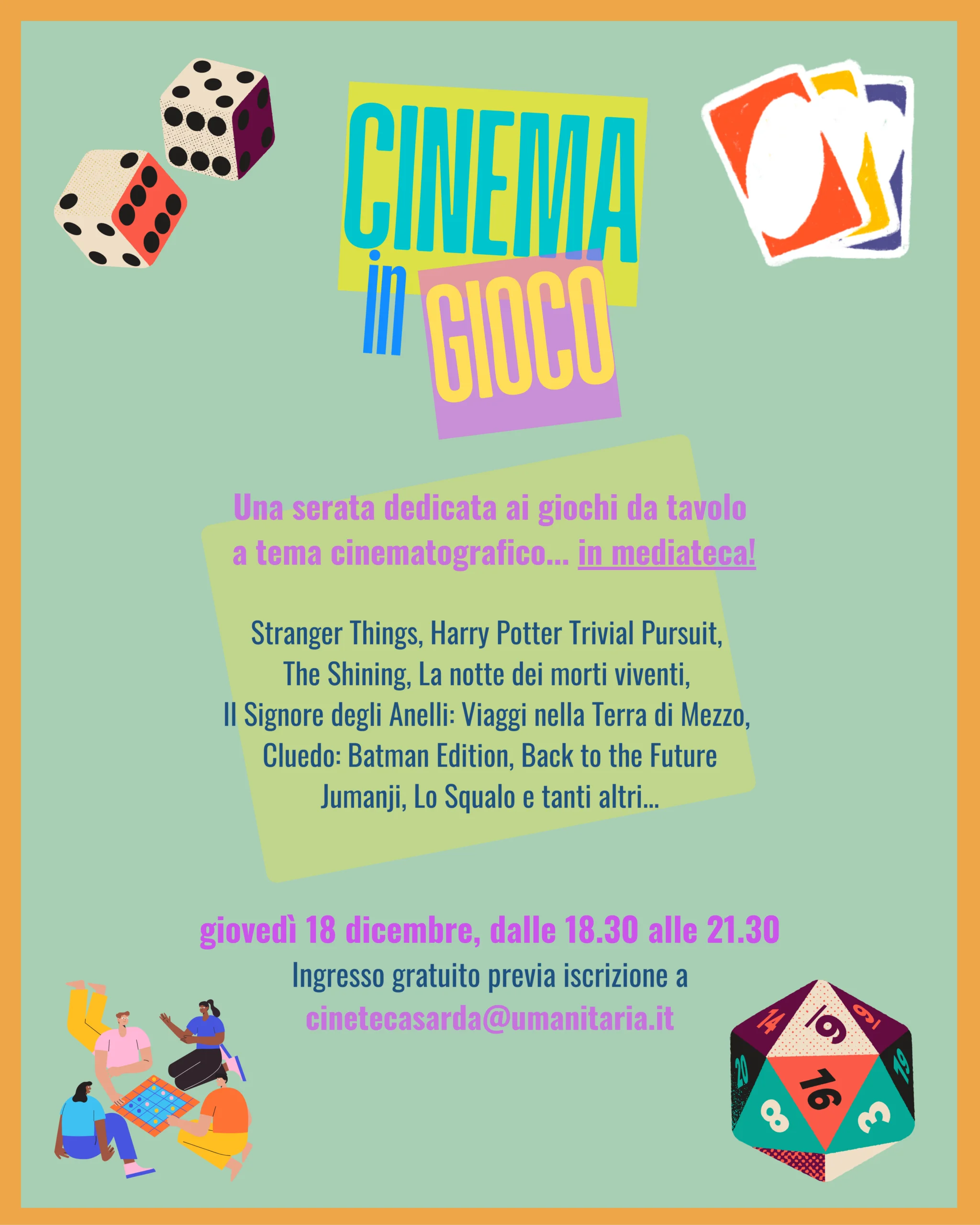 “Cinema in gioco” è l’appuntamento mensile in mediateca con i giochi da tavolo a tema cinematografico. Un evento aperto a tutte e tutti, pensato per vivere il cinema in modo nuovo: attraverso il gioco, la partecipazione e il divertimento condiviso.