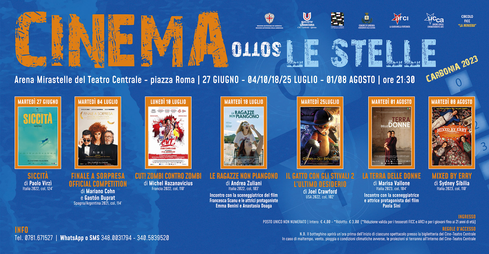 N.B. Il botteghino aprirà un’ora prima dell’inizio di ciascuno spettacolo presso la biglietteria del Cine-Teatro Centrale. In caso di maltempo, vento, pioggia o condizioni climatiche avverse, le proiezioni si terranno all’interno dei locali del Cine-Teatro Centrale.