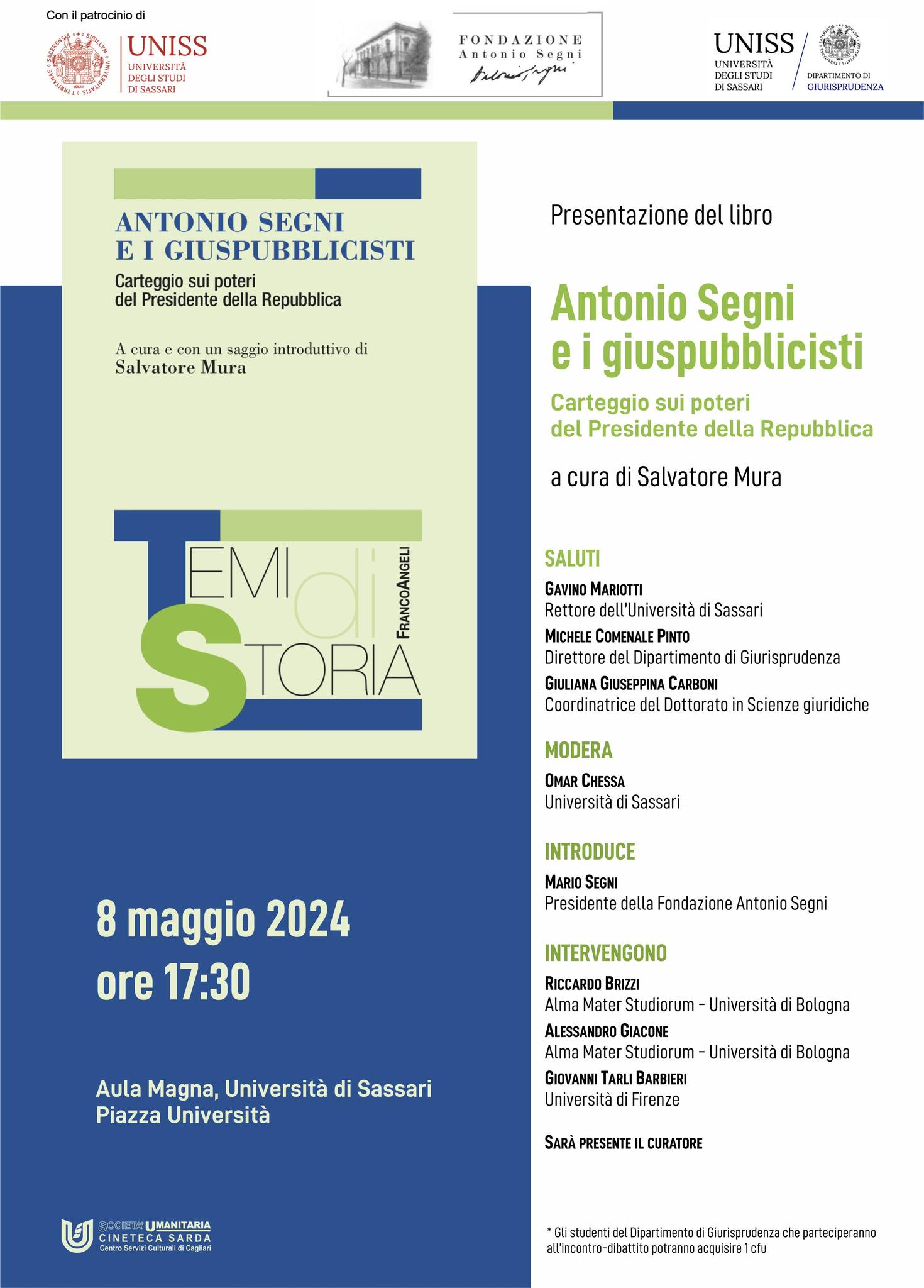 La presentazione del volume “๐€๐ง๐ญ๐จ๐ง๐ข๐จ ๐’๐ž๐ ๐ง๐ข ๐ž ๐ข ๐ ๐ข๐ฎ๐ฌ๐ฉ๐ฎ๐›๐›๐ฅ๐ข๐œ๐ข๐ฌ๐ญ๐ข. ๐‚๐š๐ซ๐ญ๐ž๐ ๐ ๐ข๐จ ๐ฌ๐ฎ๐ข ๐ฉ๐จ๐ญ๐ž๐ซ๐ข ๐๐ž๐ฅ ๐๐ซ๐ž๐ฌ๐ข๐๐ž๐ง๐ญ๐ž ๐๐ž๐ฅ๐ฅ๐š ๐‘๐ž๐ฉ๐ฎ๐›๐›๐ฅ๐ข๐œ๐š”, a cura e con un saggio introduttivo di Salvatore Mura, docente di Storia contemporanea nel Dipartimento di Giurisprudenza dell’UNISS.