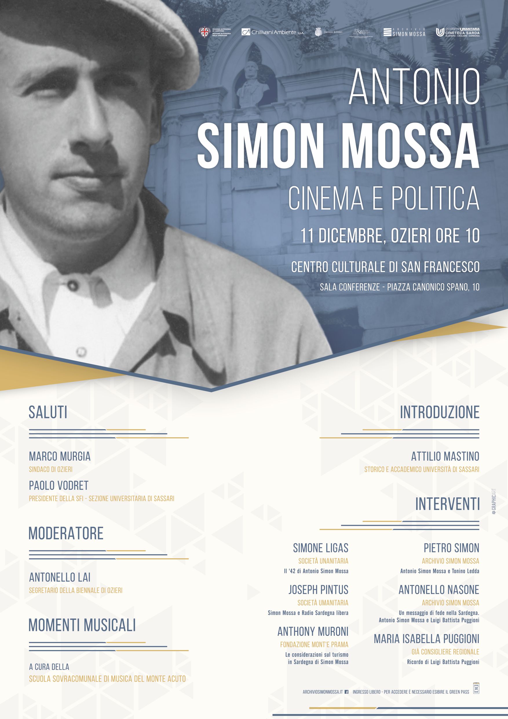La nuova stagione di studi su Antonio Simon Mossa, emersa qualche anno fa col ritrovamento del suo archivio personale e con la recente pubblicazione di un manuale di cinematografia dal titolo 𝘗𝘳𝘢𝘹𝘪𝘴 𝘶𝘯𝘥 𝘒𝘪𝘯𝘰-𝘗𝘳𝘢𝘴𝘴𝘪 𝘦 𝘤𝘪𝘯𝘦𝘮𝘢, ha spinto la SFI-Sezione Universitaria di Sassari, in collaborazione con il Laboratorio di Antropologia Visuale della Società Umanitaria – Cineteca Sarda di Cagliari e l’Archivio Simon Mossa e grazie al patrocinio del Comune di Ozieri e della società Chilivani Ambiente, di promuovere un convegno nella città di Ozieri, al fine di ricordare la poliedrica figura di Simon Mossa nei suoi interessi cinematografici, radiofonici e politici.
