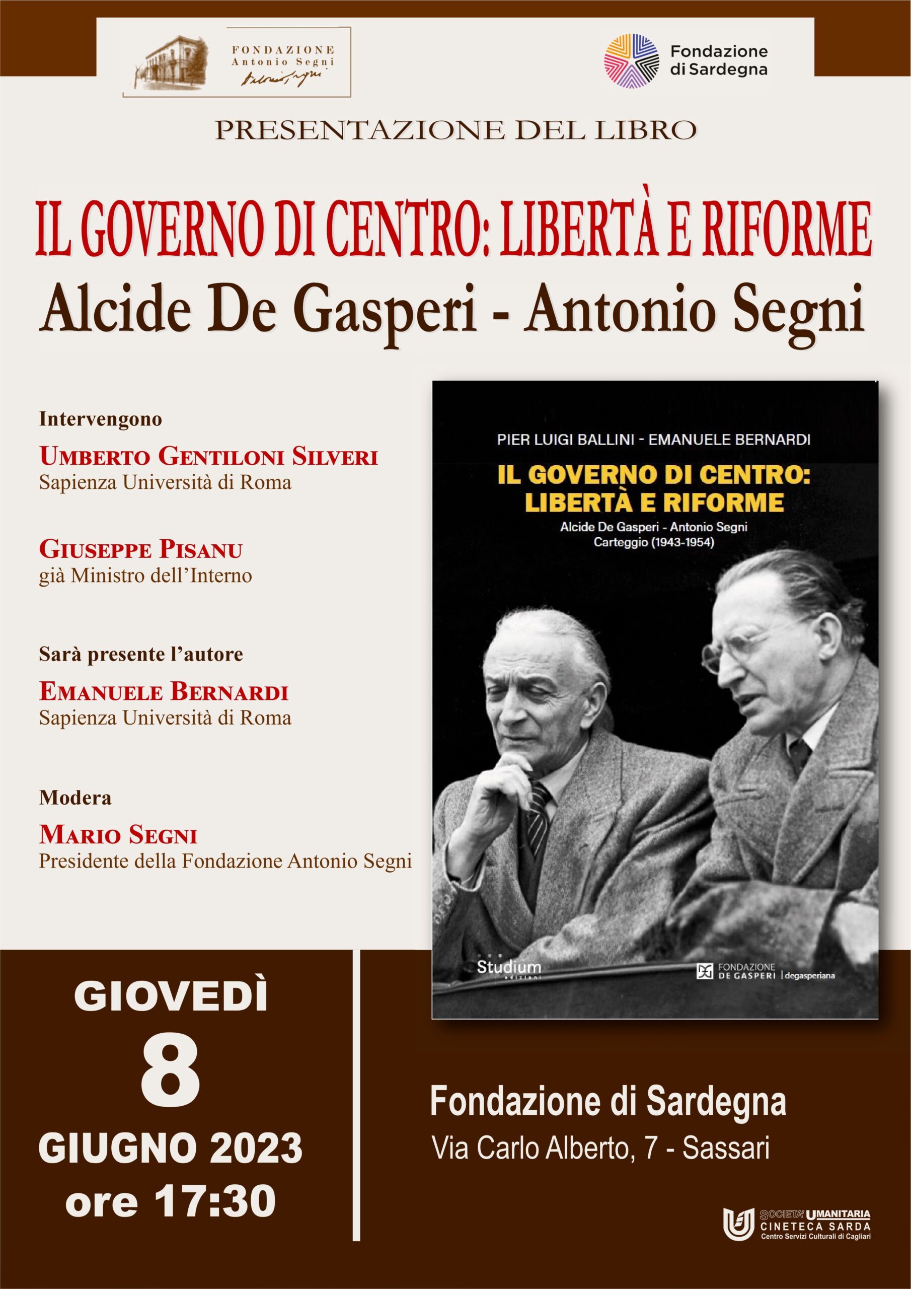 Il carteggio privato tra Alcide De Gasperi e Antonio Segni, compulsato e analizzato nel nuovo libro di Pier Luigi Ballini ed Emanuele Bernardi dell’Università La Sapienza di Roma. Se ne parla nell’interessante dibattito presso la sala conferenze della Fondazione di Sardegna a Sassari. Intervergono Umberto Gentiloni Silveri dell’Università La Sapienza di Roma; Giuseppe Pisanu, già Ministro dell’Interno. Modera l’onorevole Mario Segni. Organizzano la Fondazione Antonio Segni e il Laboratorio di Antropologia Visuale “Fiorenzo Serra” di Sassari della Società Umanitaria.