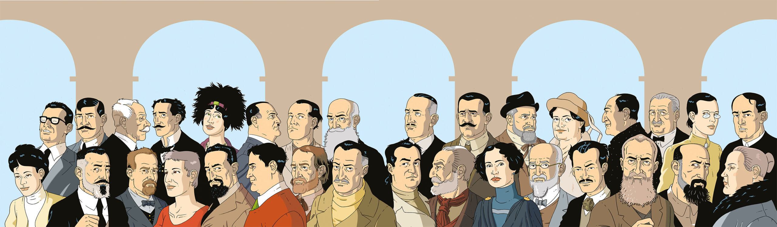 Da sinistra, in alto, Nino Chiappano, Alessandro Mazzucotelli, Sabatino Lopez, Ettore Fabietti, Lyda Borelli, Riccardo Bauer, Marino Marini, Lodovico D’Aragona, Felice Ferri, Barnardino Mazza, Filippo Turati, Maria Montessori, Albe Steiner, Carlo Gatti, Linda Malnati, Umberto Boccioni.