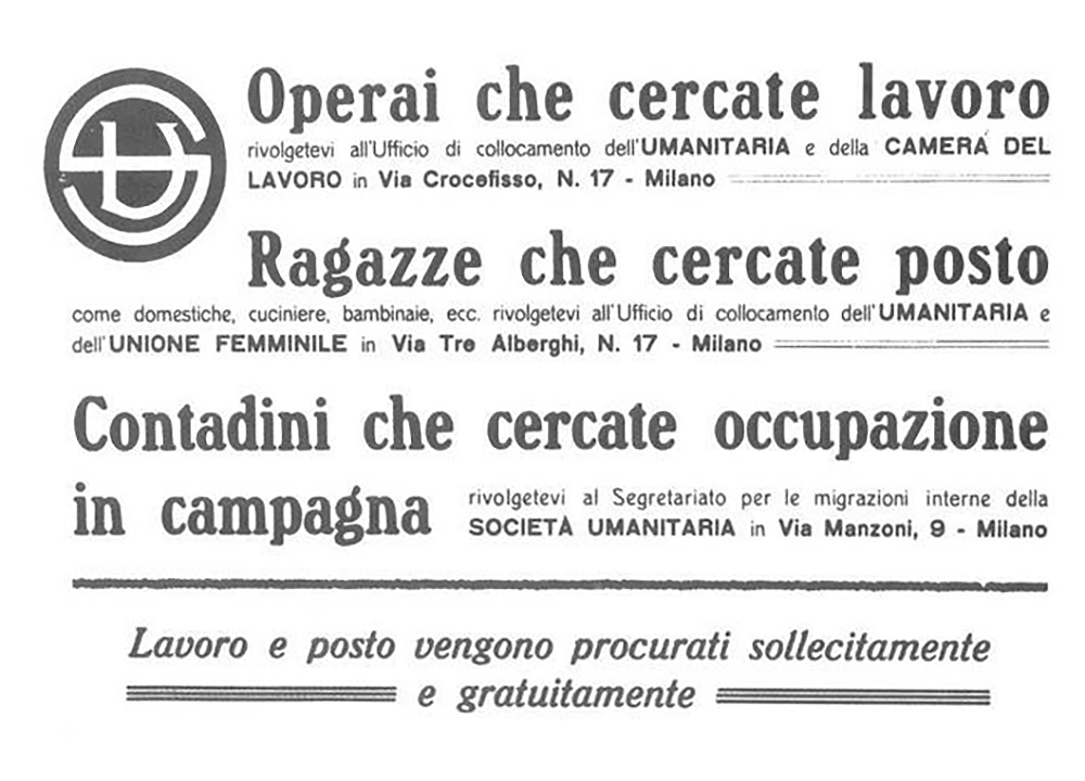 L’Ufficio di collocamento per le domestiche con annessa Pensione-dormitorio è la seconda iniziativa pionieristica che trova alimento nel sodalizio fra le due istituzioni. Realizzato a partire dal 1905 nella sede dell’Unione femminile, e sostenuto economicamente dall’Umanitaria, è uno sportello di raccordo tra domanda e offerta di impiego e si rivolge a una delle categorie di lavoratrici meno riconosciute, più sfruttate ed esposte al mercato della prostituzione e della tratta. L’assistenza al collocamento è indirizzata a donne tra i quattordici e i cinquantacinque anni che cercano lavoro come domestiche, cuoche, cameriere, personale d’albergo e d’istituti. Nel 1919 l’Ufficio sarà riconosciuto e sussidiato dallo Stato.