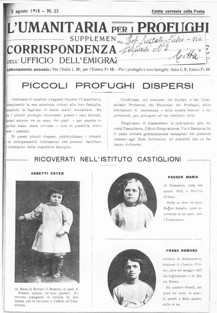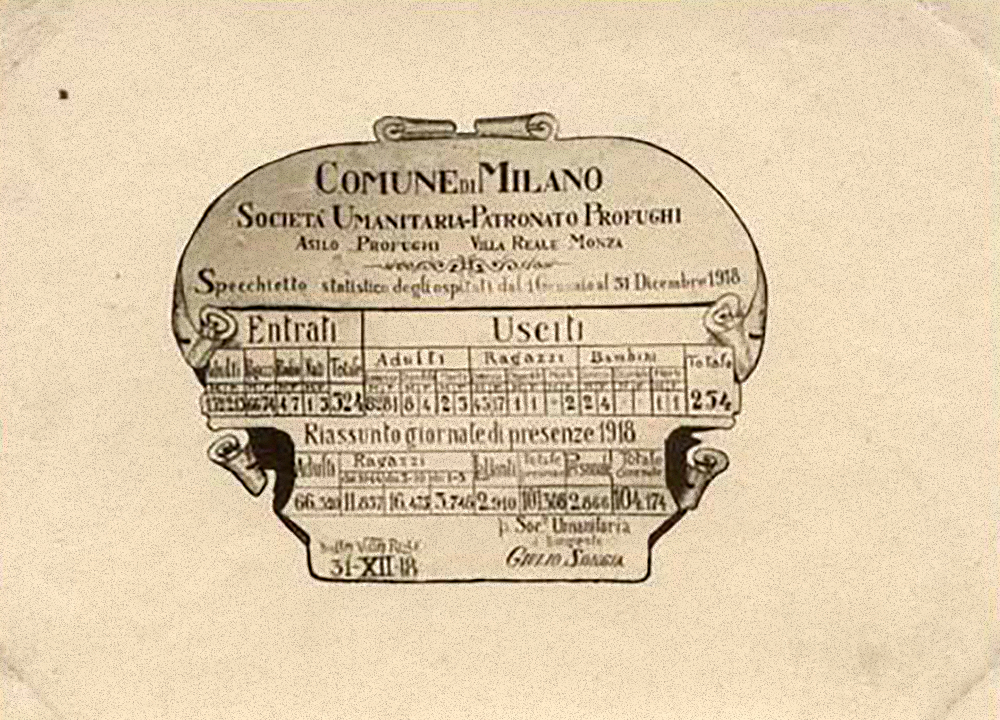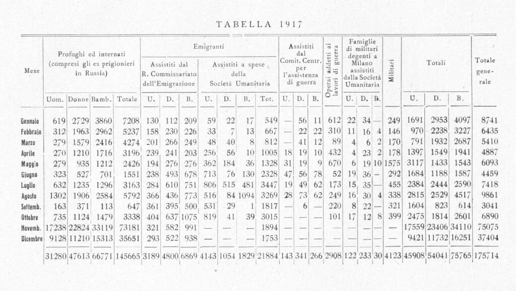Tuttavia, oltre a fronteggiare l’emergenza, l’Umanitaria (guidata dal senatore Luigi Della Torre) si preoccupò di allestire alcuni servizi in grado di permettere ai profughi di ricongiungersi con le proprie famiglie e poter trovare lavoro. Furono quindi fondamentali l’Ufficio di Ricerche e Informazioni, il quale provvide anche alla pubblicazione di un foglio periodico (“L’Umanitaria per i profughi”), e – di fondamentale importanza – l’Ufficio di collocamento per profughi: molti di loro, infatti, manifestarono il desiderio e il bisogno di poter provvedere alle proprie famiglie grazie ad un lavoro, per non pesare sulla beneficenza cittadina. Infine, vanno ricordati gli Asili e le scuole per i piccoli e l’ospitalità offerta presso la Villa Reale di Monza, che il sovrano aveva concesso in uso al Comune di Milano, dove trovarono alloggio circa 300 profughi, adulti e bambini: la gestione dei profughi venne affidata all’Umanitaria.