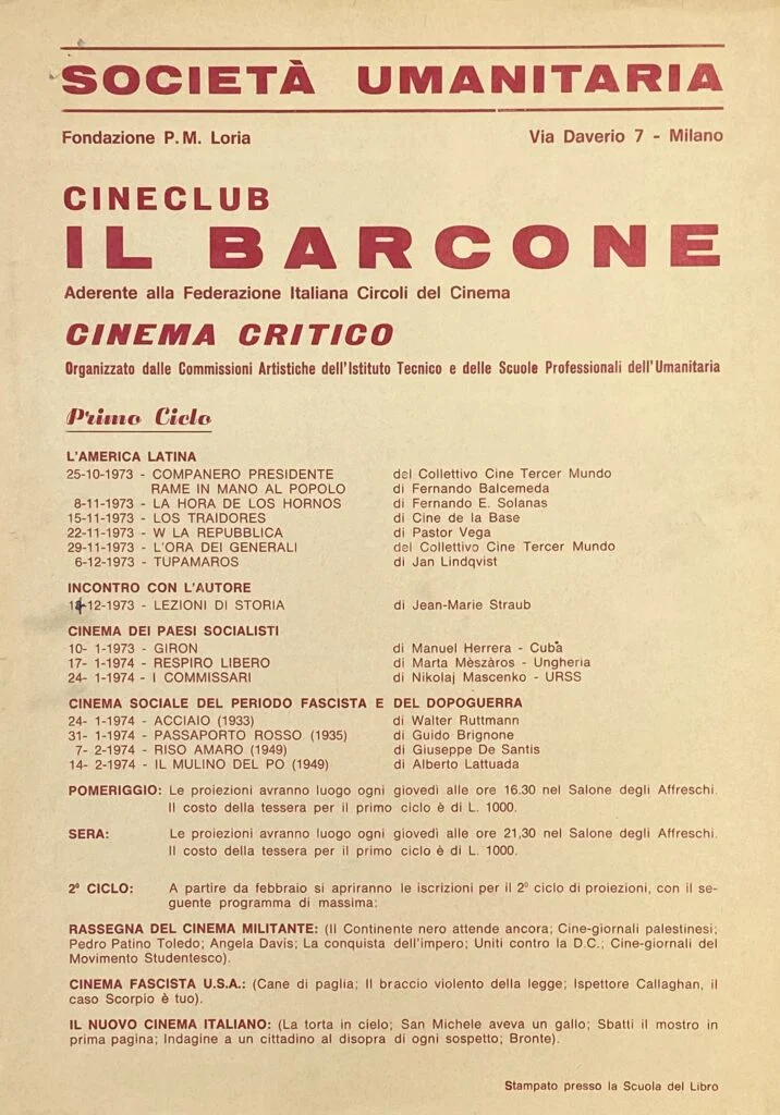 Quarant’anni dopo, nel 1963, con la presidenza di Riccardo Bauer (già propulsore del convegno internazionale “Il cinema come strumento di cultura popolare” – 1959) finalmente l’Umanitaria si fa promotrice di una vera e propria attività cinematografica, che si inaugura con Orizzonti di gloria di Stanley Kubrick. Due anni dopo, in collaborazione con la Casa della Cultura, nasce un vero cineclub con proiezioni nel Salone degli Affreschi: e l’immagine scelta come logotipo è “Il Barcone”, esplicito riferimento ad uno strumento da utilizzare per elevare culturalmente giovani (in orari scolastici ed extra scolastici) e meno giovani, con discussioni fino a tarda notte.