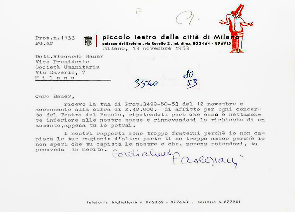 A risolvere la debacle, la sinergia di Riccardo Bauer con Paolo Grassi, promotore “del teatro come un pubblico servizio” (e presto eletto consigliere dell’Umanitaria). Di qui la decisione di trasferire l’attività concertistica al Piccolo Teatro. “Milano, 19 ottobre 1950. Il Piccolo Teatro ospiterà nella stagione 50/51 n. 9 concerti del Teatro del Popolo per la cifra forfettaria di lire 40.000. Il Piccolo Teatro sarà a disposizione del Teatro del Popolo per le prove dei concerti per due ore ogni concerto in ore da stabilirsi”.