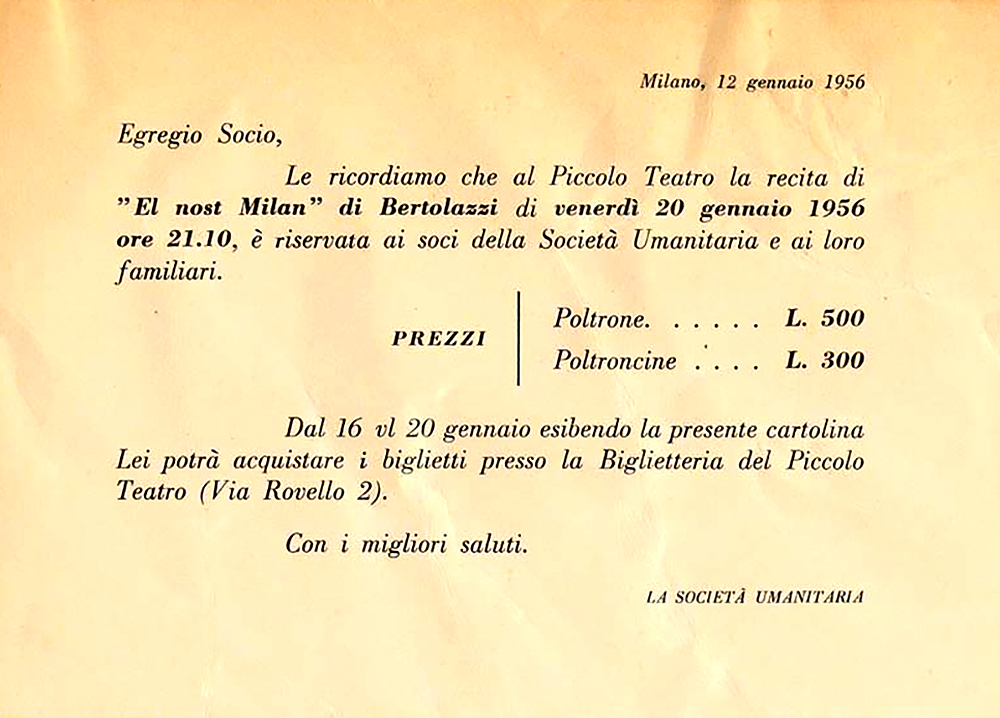 Nel luglio 1947 una relazione a Ludovico D’Aragona, l’antico capo riformista della Camera del Lavoro, allora Commissario Straordinario dell’Umanitaria, rappresentava l’esigenza che “il problema del Teatro del Popolo [sia] affrontato seguendo il criterio di concentrare gli sforzi necessari per la sua definitiva risoluzione, piuttosto che quello di disperderli moltiplicando le iniziative”.