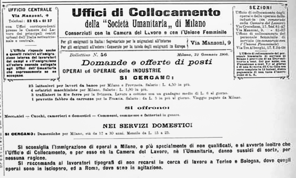 In assenza totale di una regolamentazione statale del settore, le agenzie di collocamento private erano numerose e la maggior parte di queste – come metteva bene in luce Giovanni Montemartini, ideatore e dirigente dell’Ufficio del Lavoro dell’Umanitaria, in un articolo pubblicato su “Critica Sociale” nel 1902 – erano rette da meschini speculatori che si arricchivano “sulla pelle dei lavoratori: sulla nostra piazza, ad esempio, si calcola che vi siano 80 mediatori per il collocamento dei camerieri. L’intermediario ha anche interesse a non trovare uno stabile posto al disoccupato perché ad ogni cambiamento egli percepisce una nuova mediazione e i prezzi di mediazione per certi mestieri sono altissimi e veramente sfruttatori delle misere condizioni dei lavoratori disoccupati”.