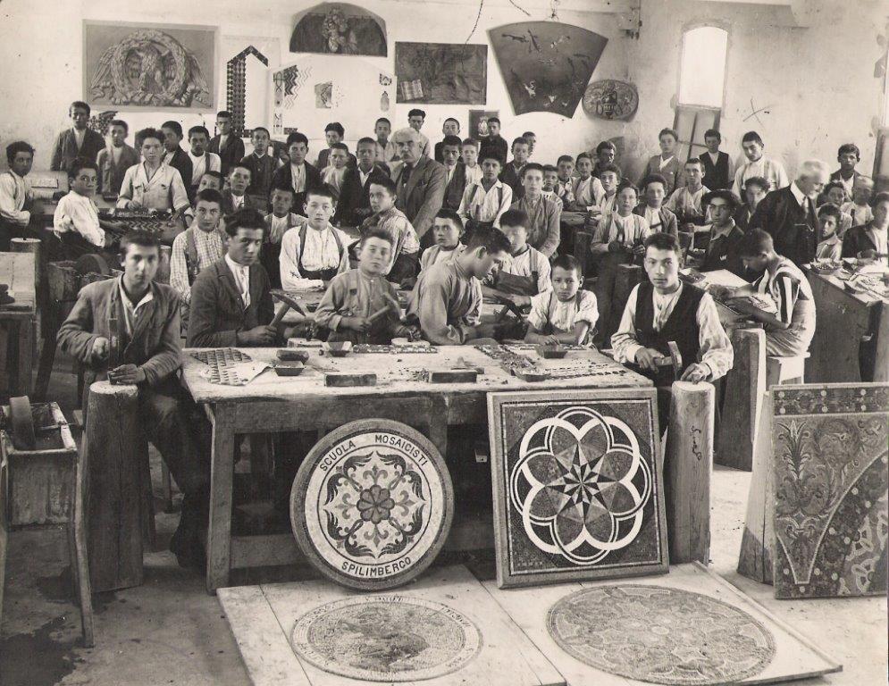 Era il 22 gennaio del 1922 quando, d’intesa con l’Umanitaria (che ne avrebbe seguito lo sviluppo fino all’avvento del fascismo), fu avviata la lezione inaugurale della Scuola. Nel labile tessuto socio-culturale del primo dopoguerra, gli allievi vedevano nell’Istituto un’importante opportunità, sapevano di poter imparare un’arte e un mestiere dignitosi e stimolanti. Fin dalle sue origini la Scuola Mosaicisti del Friuli ha realizzato lavori di grande prestigio, di respiro internazionale. Il primo è il mosaico presentato alla Biennale di Monza a corredo della Fontana progettata da Raimondo D’Aronco (1923), seguito da una collaborazione significativa con il designer Marcello Nizzoli per la realizzazione di elementi d’arredo promozionali per la Campari.