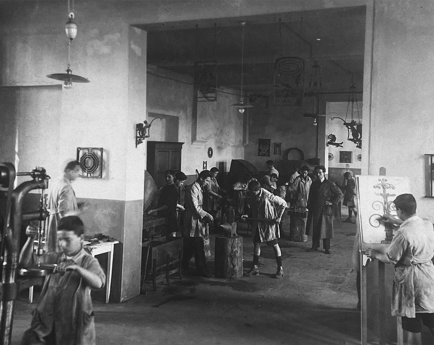 Uno dei tanti corsi professionali per i giovani – quello del ferro battuto – all’ISIA, l’Istituto Superiore di Industrie Artistiche di Monza (Anni Trenta, foto in alto).
