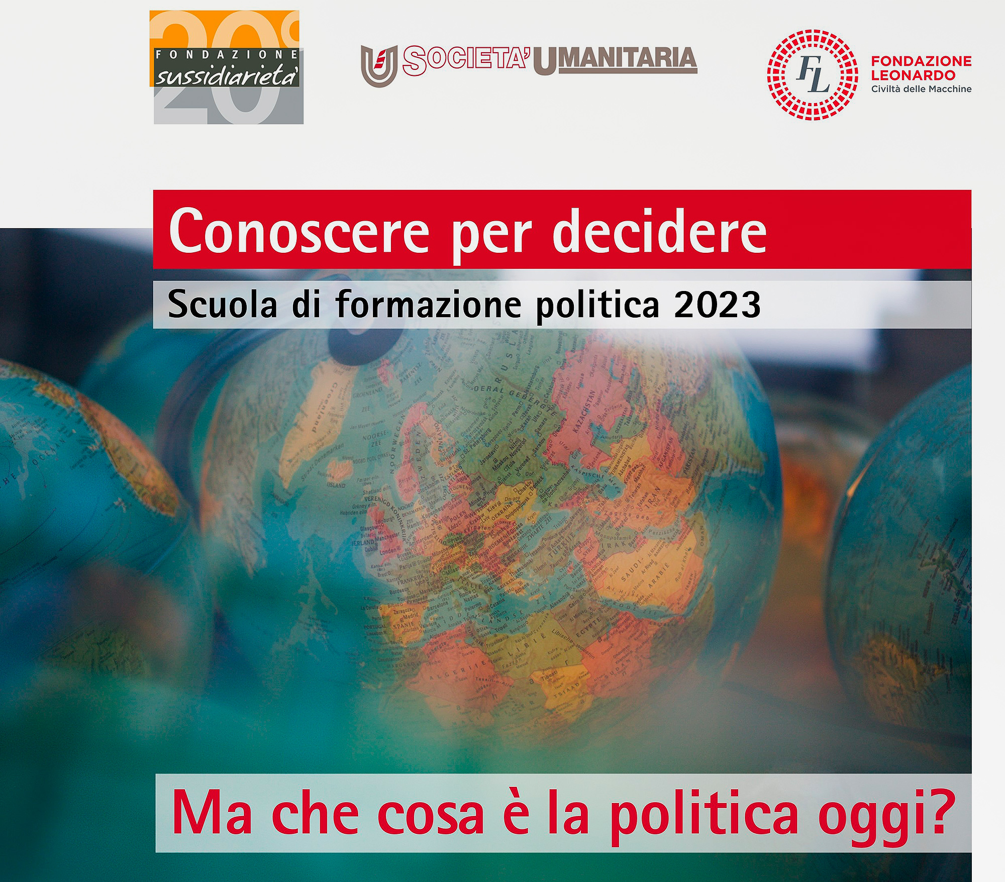 Insieme alla Fondazione Sussidiarietà e a Fondazione Leonardo – Civiltà delle Macchine prende il via la Scuola di formazione politica, intitolata Conoscere per decidere: un ciclo di seminari con politici, amministratori pubblici, giuristi ed economisti allo scopo di costruire una tavola di discussione aperta e costruttiva, per riportare la società civile ad un interesse verso la polis.